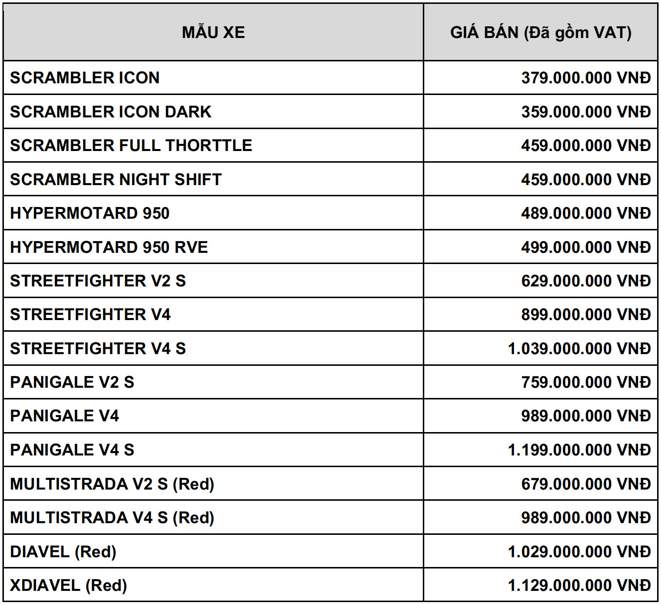 Trong sự kiện tái khởi động, Ducati còn công bố giá bán chính thức của các mẫu xe 2025 tại thị trường Việt Nam. Nổi bật trong số đó có Scrambler Icon (379 triệu đồng), Streetfighter V4 S (1,039 tỷ đồng) và Panigale V4 S (1,199 tỷ đồng).