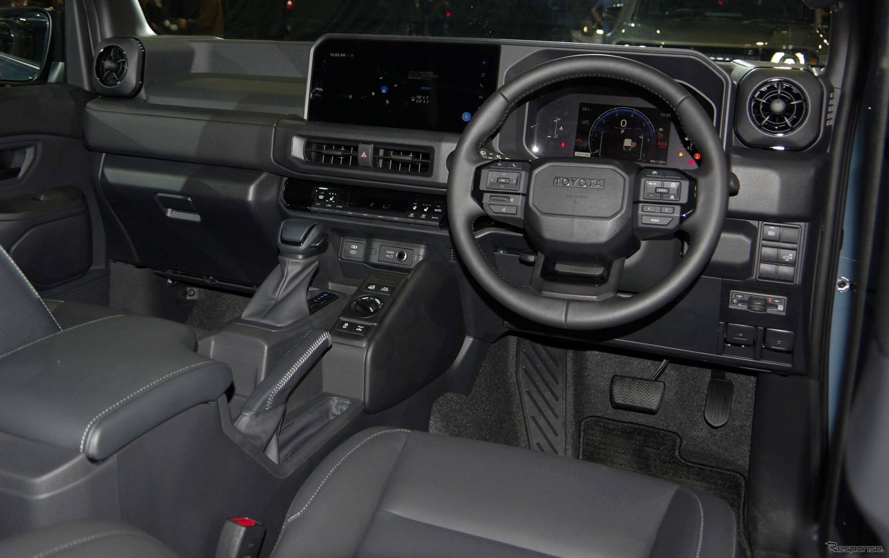 Bên trong, người dùng cảm nhận không khí quen thuộc từ Land Cruiser 250, từ mặt táp-lô phẳng và thấp, màn hình cảm ứng liền mạch với bảng đồng hồ cho đến vô-lăng ba chấu to bản. Vật liệu nhựa cứng chiếm chủ yếu, cửa gió điều hòa sát cánh cửa kiểu hình tròn cổ điển. Xe được trang bị phanh tay cơ, dẫn đến một số điều chỉnh liên quan khả năng hoạt động của gói hỗ trợ người lái nâng cao Toyota Safety Sense.