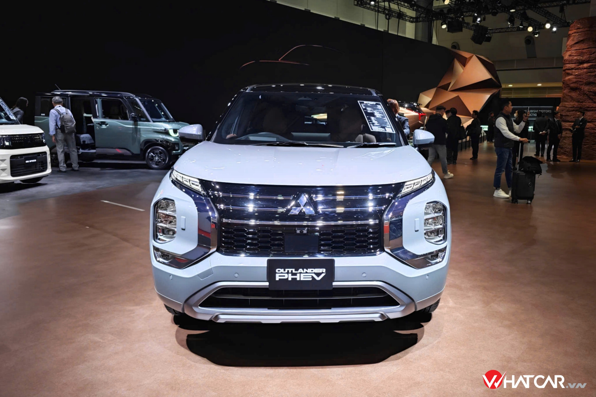 Sau bản nâng cấp giữa vòng đời vào năm 2024, Outlander PHEV trông liền lạc, nam tính và tân thời hơn. "Gương mặt" khỏe khoắn nhờ dải mạ crôm to bản hình chữ "X" quanh lưới tản nhiệt tự động đóng/mở. Đèn pha LED đặt thấp đi kèm tính năng rửa đèn, tách biệt với dải đèn LED định vị ban ngày kiêm xi-nhan và đèn sương mù nằm ẩn trong dải crôm.