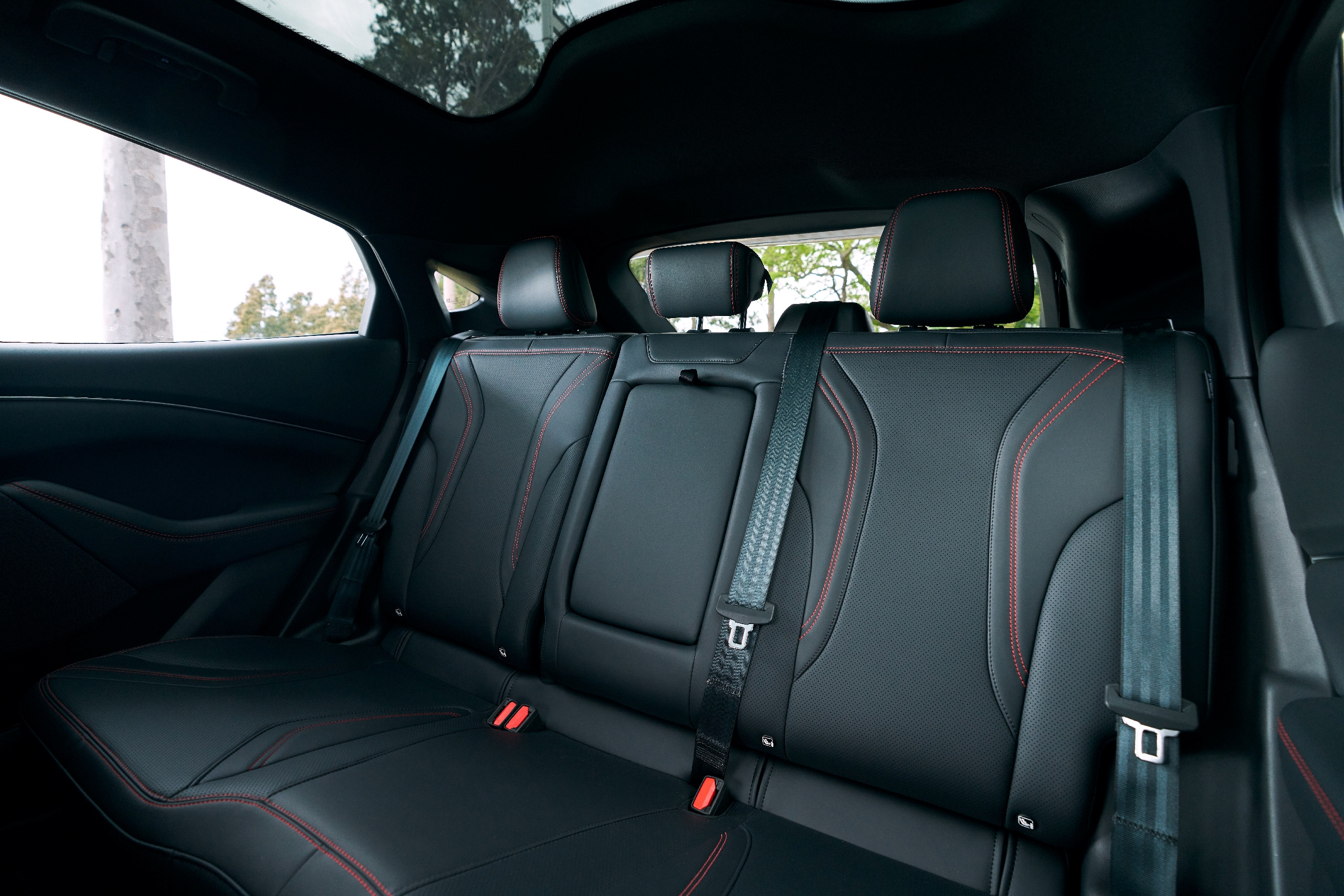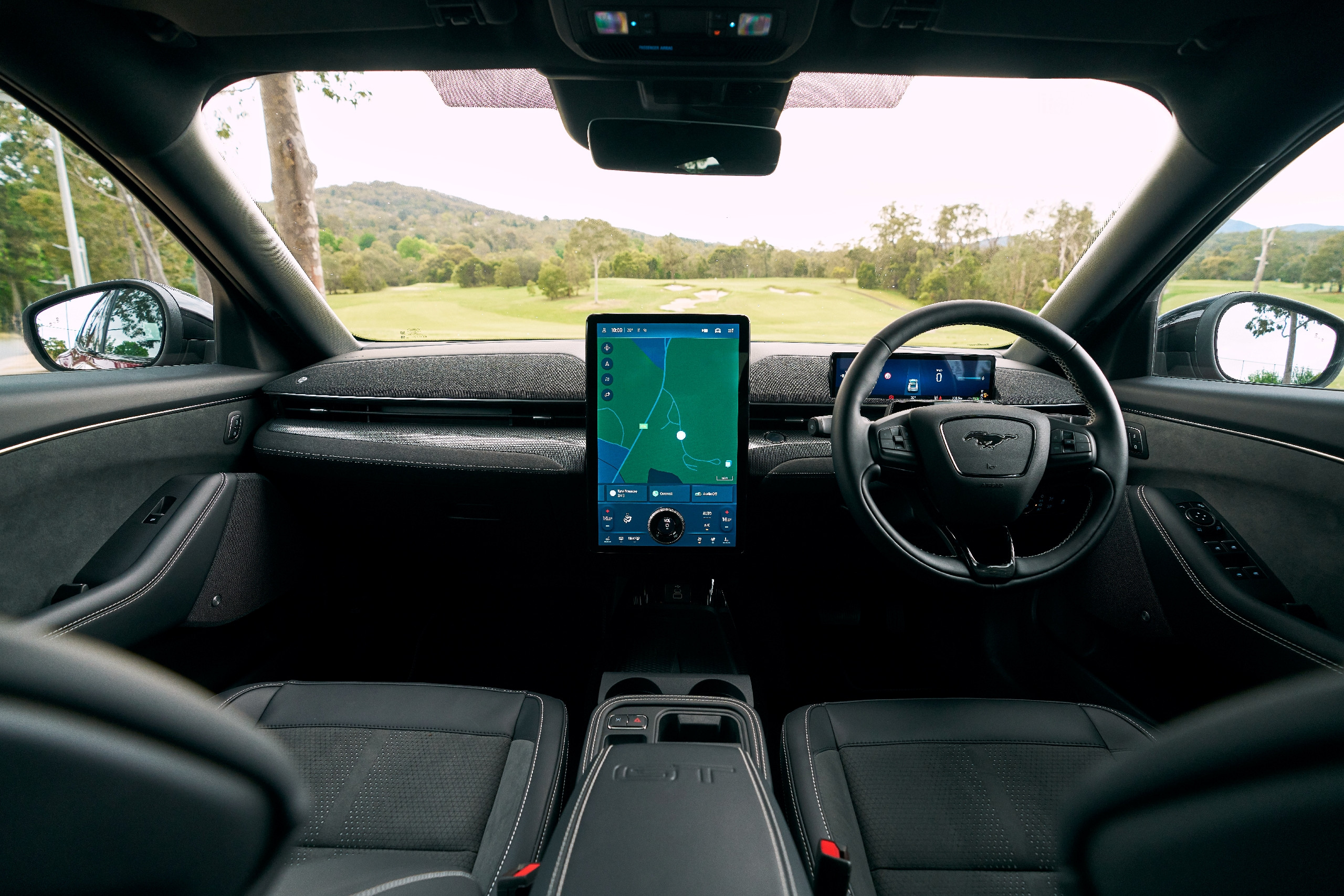 Tiến vào khoang lái, Mach-E mang đến không gian rộng rãi cho 5 người, sở hữu vật liệu cao cấp như da tổng hợp Sensico, nhựa mềm và viền kim loại anodized. Phiên bản Select cơ bản với ghế chỉnh điện 8 hướng, tính năng thông gió/sưởi ấm và nhớ vị trí xuất hiện từ phiên bản Premium, trong khi GT được bổ sung ghế thể thao ôm sát với logo GT thêu nổi.