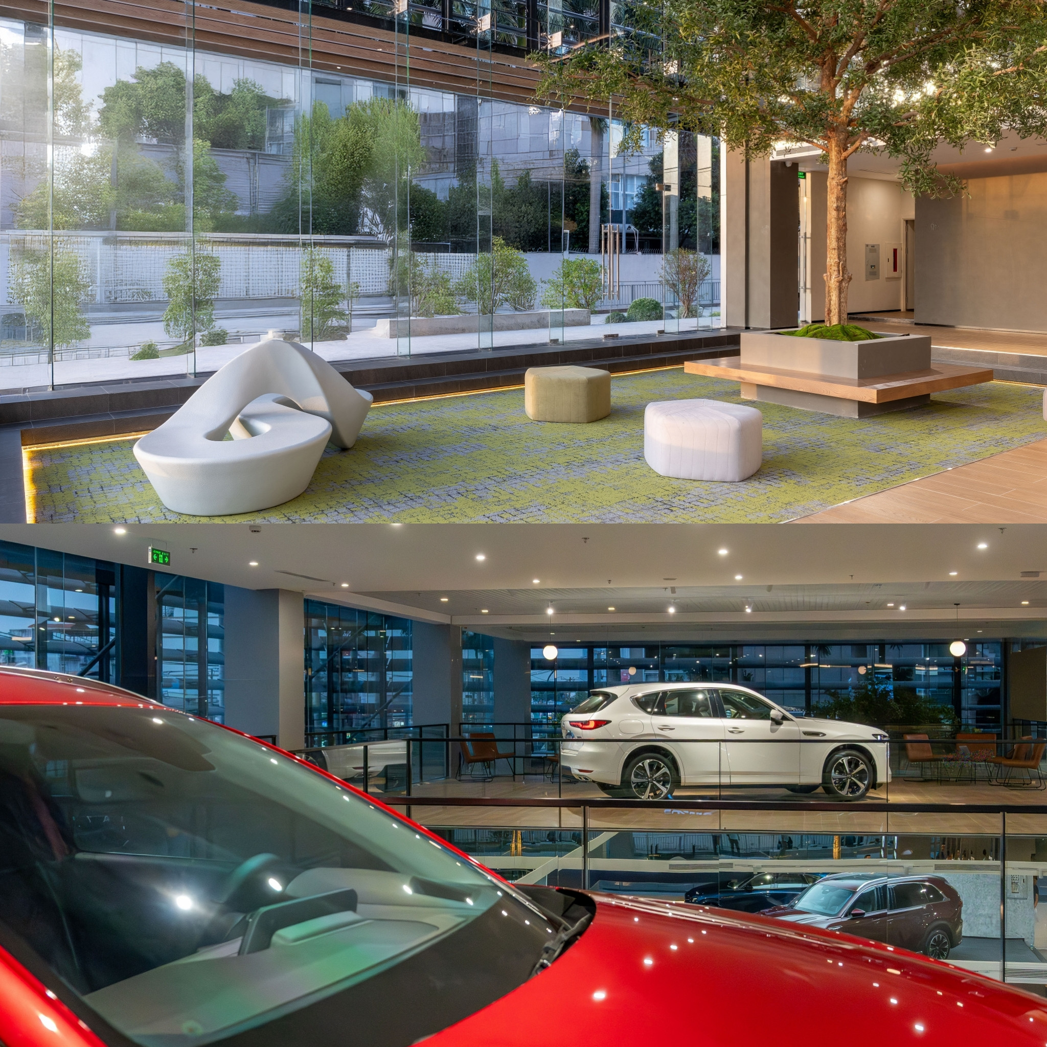 Vào ban đêm, ánh sáng nội thất tạo nên một diện mạo sống động và đầy cảm xúc. Không gian cảnh quan được kiến tạo với mái hiên mở rộng, cây xanh và các khu vực chuyển tiếp liền mạch, giúp showroom không chỉ là nơi trưng bày xe mà trở thành một phần gắn kết với thành phố.