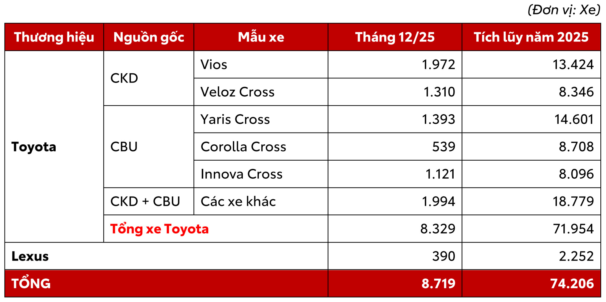 Kết quả này đưa lũy kế doanh số của hãng xe Nhật Bản trong năm 2025 - kỷ niệm 30 năm thành lập của TMV - lên 71.954 xe, tăng 8,1% so với năm 2024.